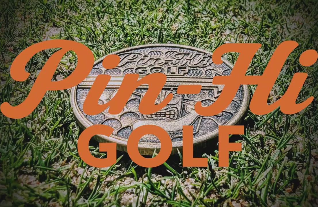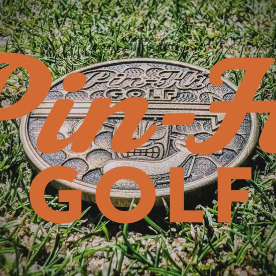 One side of a 40mm solid brass marker is yours to design—upload a photo, pet, logo (with rights), or text. The other side features our Pin-Hi design with a bold alignment arrow, tiki mascot, and dimple texture.